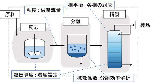 化学プロセス、例えば反応や分離、精製のプロセスがありますが、そのどのプロセスにおいても相平衡や粘度といった化学工学物性が関わっています。すなわち、これらのプロセスの設計をするためには化学工学物性が不可欠です。日々の研究開発の成果により、数多くの化学物質が開発されていますが、それらを化学プロセスにおいて使用するために必要な化学工学物性の報告はもちろんありません。化学工学物性の測定には、専門的な装置と技術、そして時間を必要とします。当たり前のようにあると思われがちな物性ですが、現状として報告されているものはほんの一握り、限られたものしかありません。化学工学の中でも、基礎物性分野はこれらの化学工学物性についての研究を行う分野となっています。