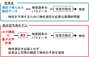 実際の物質に適用可能な状態方程式による計算は、実測の物性から物質固有のパラメータを得て、それを状態方程式で使用し、物性を予測します。つまり、物性を予測するために物性を必要とするといった循環的問題が生じています。この問題に対して、AIを組み合わせ、「状態方程式」と「AI」の融合型モデルにより物性を必要とせずに物性を予測する新たなモデルを開発しています。