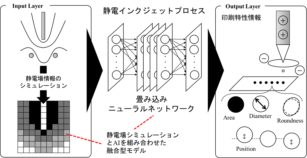 静電インクジェットは、高電圧を加えた静電場内でノズル先端から小さな液滴を生成し基盤に塗布する微細加工、微細塗布の製造技術です。しかし、印刷される滴の幅は電場、材料特性などのプロセス・実験パラメータに大きく影響を受けます。印刷特性はもっぱら経験的に求められています。本研究では、画像認識などに使われている畳み込みニューラルネットワークを導入することで、表現が困難であった静電場形状の入力パラメータ化を達成します。静電場シミュレーションとAIを組み合わせた融合型モデルとなっています。これにより、静電インクジェットの汎用印刷特性予測モデルが確立され、静電インクジェットプロセスの設計・最適化を飛躍的に向上させます。